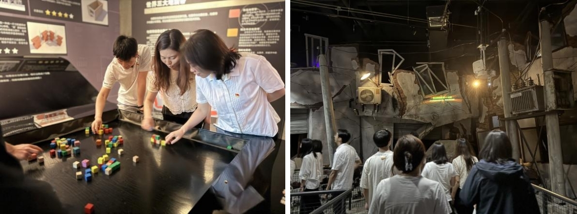 在教育館專業講解員的帶領下,黨員們參觀了館內各展區,系統學習了各類災害的特點、成因及防范措施。在火災逃生體驗區,按專業人員的指導,采取捂住口鼻,低姿彎腰等方式,沿著安全通道有序撤離,身臨其境地學習了高層住宅、地鐵等生活場景中發生火災時的逃生技巧。在地震體驗區,依次體驗了3-8級的不同震感,搭建了方塊小屋,了解縱波、橫波、縱橫波襲來時造成的不同影響,學習在不同震級情況下應采取的正確避震措施。在認識災害區,觀看了泥石流、山洪、滑坡等多種自然災害的科普視頻,進一步認識了各類自然災害的形成機制和危害特點。